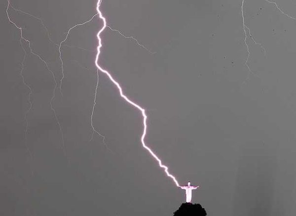Um raio cair duas vezes no mesmo lugar não viola nenhuma lei da física. Inclusive, no Cristo Redentor do Rio de Janeiro, já foi preciso consertar o polegar mais de uma vez por culpa de raios.